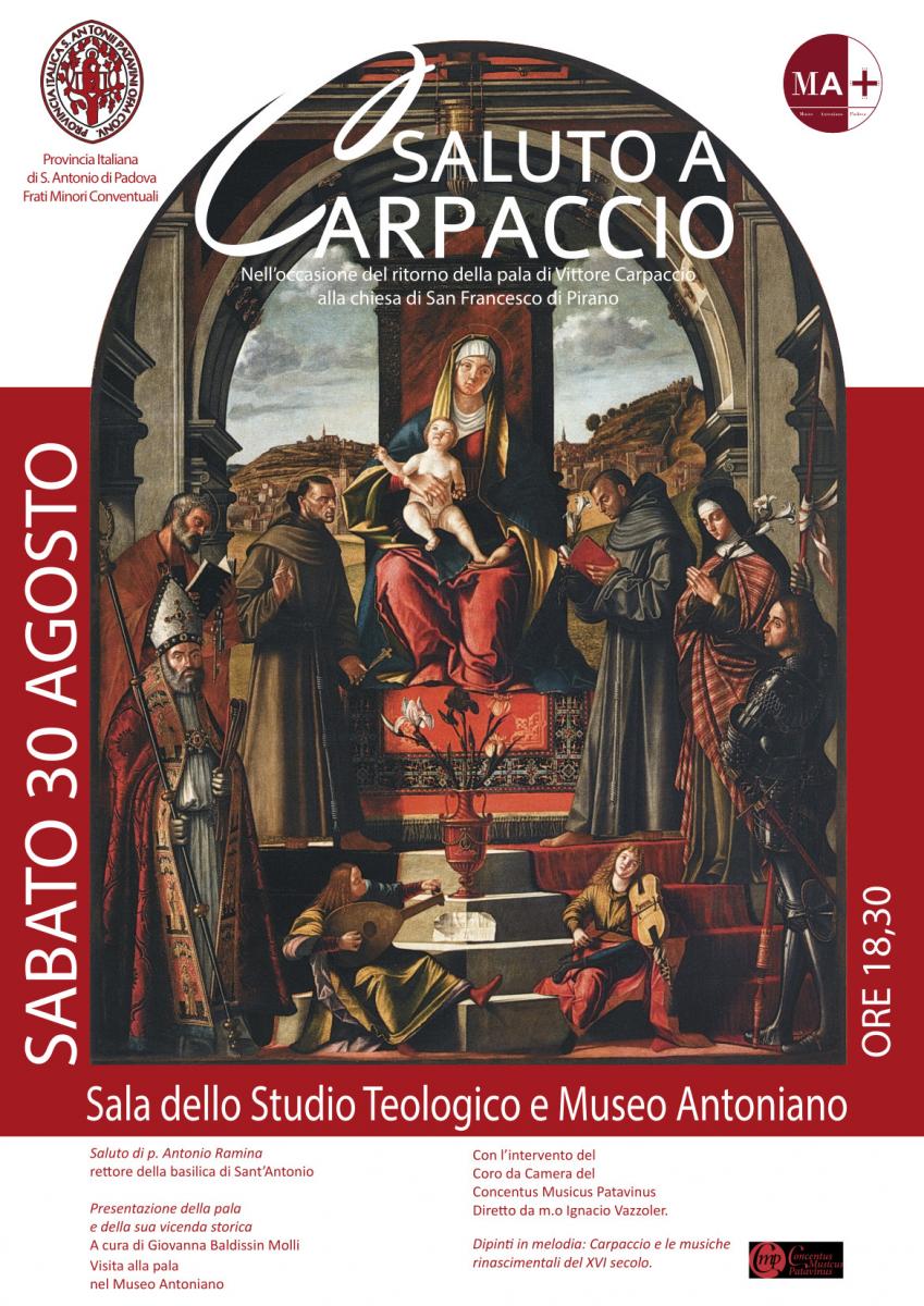 Quella della Pala della Madonna col bambino, i santi Ambrogio, Pietro, Francesco, Antonio, Chiara, Giorgio e due angeli musicanti di Vittore Carpaccio, firmata dall’artista e datata 1518 per il convento di Pirano e attualmente custodita nel Museo Antoniano del complesso basilicale del Santo, è una storia che coinvolge le due sponde dell’Adriatico (Italia e Slovenia), due conventi (quello di Sant’Antonio a Padova e quello di San Francesco a Pirano), istituzioni religiose, Belle Arti e privati, sullo sfondo della Seconda guerra mondiale fino ai nostri giorni.